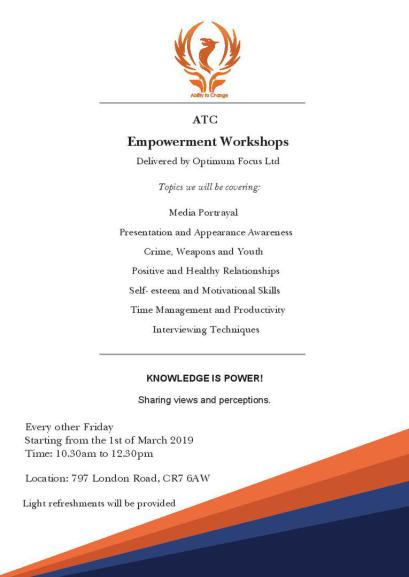 Ability to Change are now running Empowerment Workshops for our service users. The topics for this month are: 'Media Portrayal' and 'Presentation & Appearance.' The workshops are facilitated by ATC and delivered by Optimum Focus, and will run from March until May 2019. More information can be found in our Courses and Workshops page.